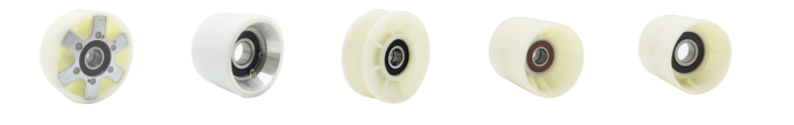I rulli delle scale mobili di alta qualità sono generalmente realizzati in tecnopolimeri come nylon e poliuretano e contengono cuscinetti di precisione. Questa struttura serve a ridurre le vibrazioni e il rumore.